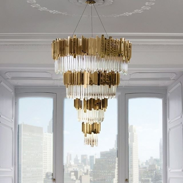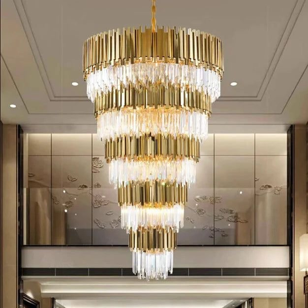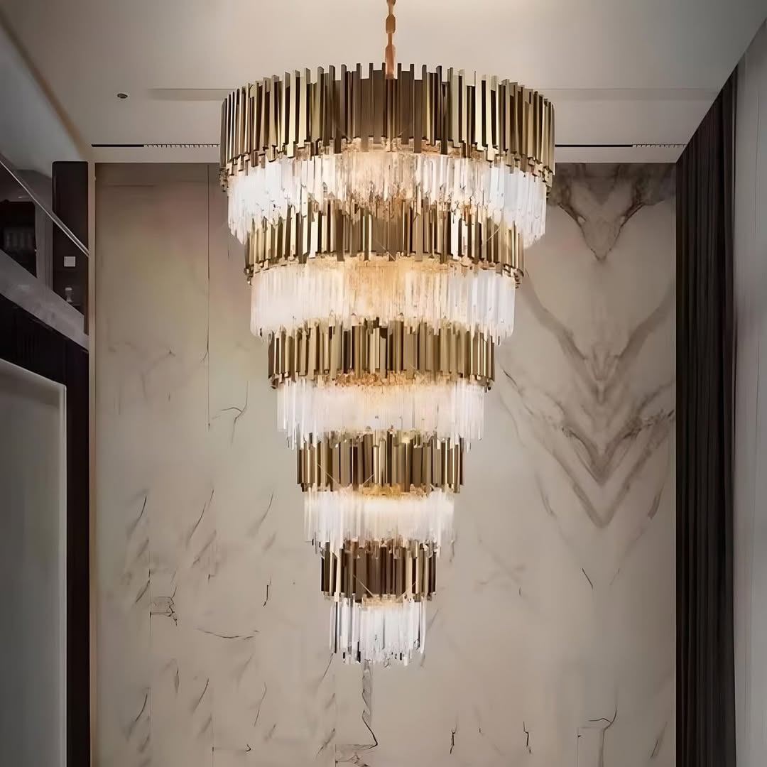 این لوستر لوکس و باشکوه با طراحی هرمی معکوس، انتخابی فوقالعاده برای فضاهای بزرگ و مجلل مانند لابی هتلها، سالنهای پذیرایی و ویلاهای لاکچری است. ترکیب هنرمندانهی فلز طلایی براق با کریستالهای شفاف، جلوهای خیرهکننده ایجاد کرده که نور را به شکلی چشمنواز در فضا منعکس میکند.