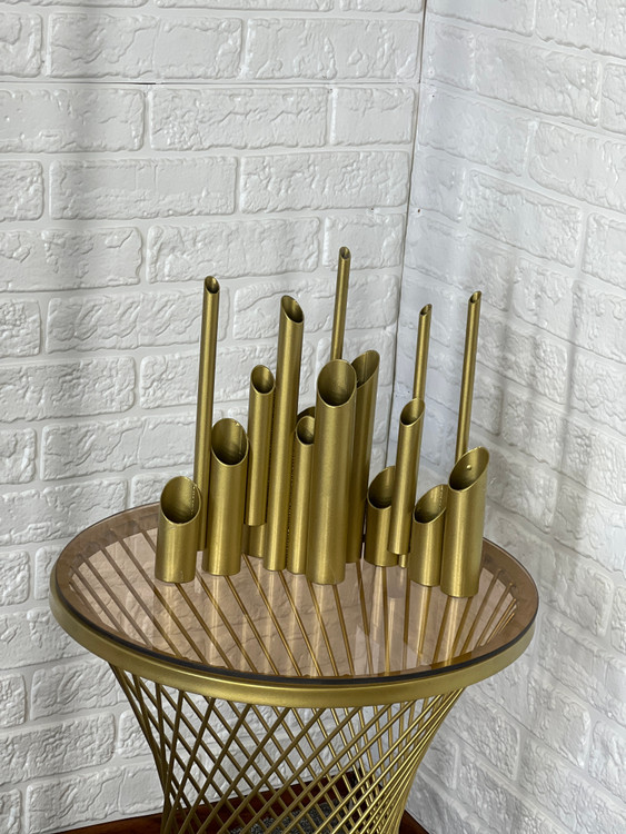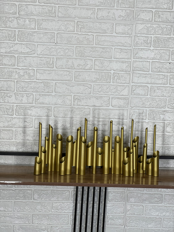 جاشمعی طلایی چند شاخه با شمع های سفید روشن، نور گرم و ملایمی را در فضای دنج و مدرن اتاق غذاخوری ایجاد کرده است. پایه های برنجی با ارتفاع های مختلف، جلوه ای هنری به میز چوبی بخشیده و فضایی آرام و دعوت کننده برای یک شب دلپذیر فراهم کرده است.